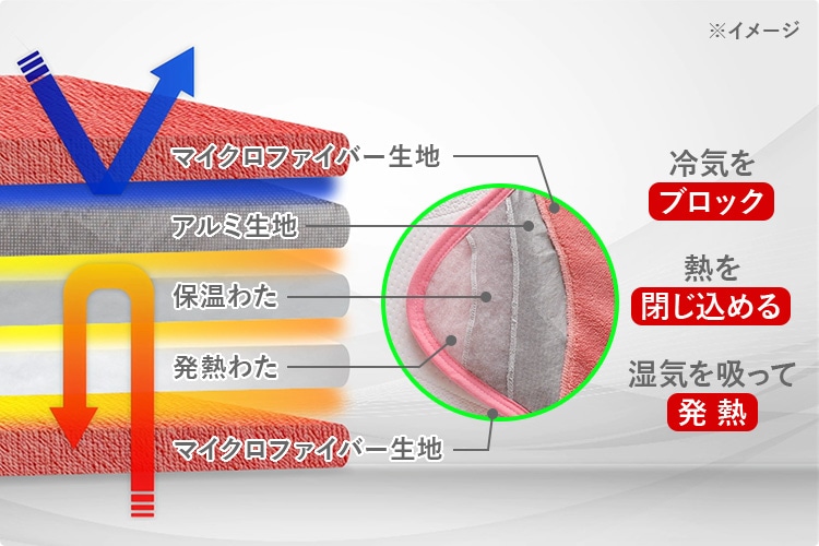 「発熱わた」「アルミシート」「発熱生地」などあらゆる素材を組み合わせて「発熱→断熱→保温」を繰り返す独自構造。抜け出せなくなる気持ちよさです。
